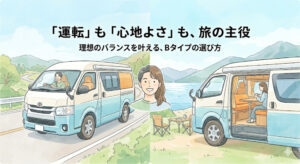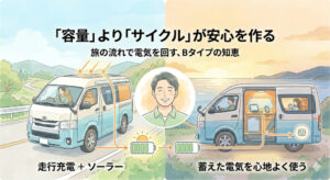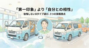 このページでは、Bタイプを検討する際に必ず整理しておきたい「サイズ」「電気」「使い方」の要点を、記事ごとにまとめています。 まずは「最初に読む1本」から順にご覧ください。あなたにとって無理のない車両サイズと、納得できる装備のベストバランスを見極めるためのヒントが見つかるはずです。