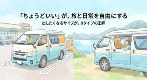 週末の短期旅だけでなく、少しゆとりを持った旅も見据えるようになると、Aタイプよりも車内の広さや設備の充実度が気になり始めます。しかし、快適さを求めて車両を大型化したり装備を盛り込みすぎたりすると、運転のしやすさや駐車のしやすさといった「普段の扱いやすさ」とのバランスが崩れてしまいがちです。