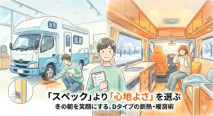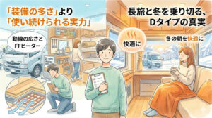 FFヒーターや断熱といった個別のスペックで満足せず、寒さや結露、電気の不安を感じずに旅を無理なく「続けられる」一台を見極めるための考え方を整理します。