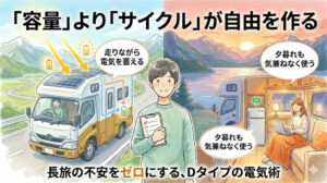 バッテリーの容量(Ah)という数字に逃げるのではなく、走行充電やソーラーを組み合わせて、使った分を旅の流れの中でどう取り戻すか。