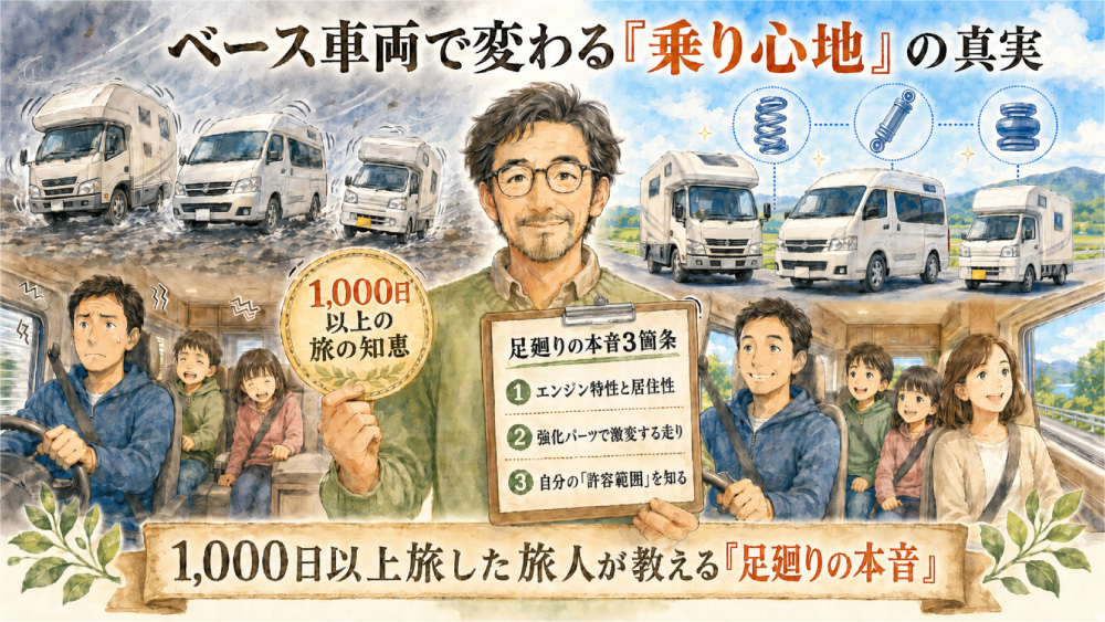 「キャンピングカーって、運転中に後ろで家族が酔わないかな?」「トラックベースは上り坂で全然進まないって聞くけど、実際はどうなの?」 カタログの内装写真にはワクワクしても、ベースとなる車両(車台)の走行性能や乗り心地については、多くの方が切実な不安を抱えています。