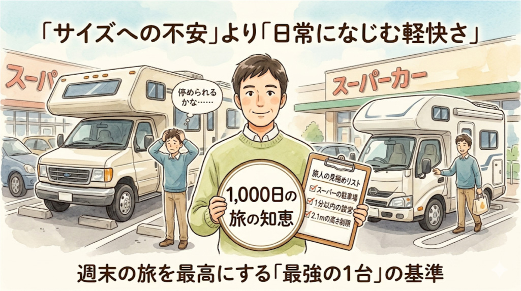 「キャンピングカーを買っても、普段の買い物に使えなかったら困るな」「大きすぎて運転が怖くなったら、結局乗らなくなるかも……」 Aタイプ(週末ライト旅派)を検討している方の最大の悩みは、この「サイズへの不安」ではないでしょうか。