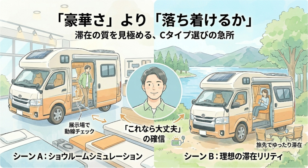 Cタイプ選びの成功は、展示場の「華やかな雰囲気」から一歩踏み出し、現実の旅のスタイルをどれだけ当てはめられるかにかかっています。