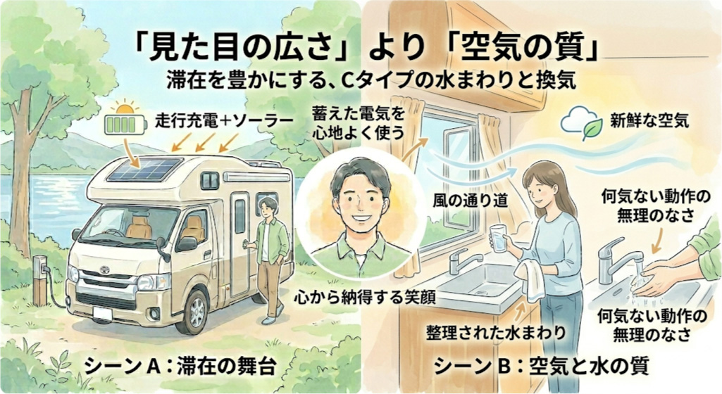 移動そのものよりも「停めたあとの時間」を大切にするCタイプでは、日常の何気ない動作が何度も繰り返されます。