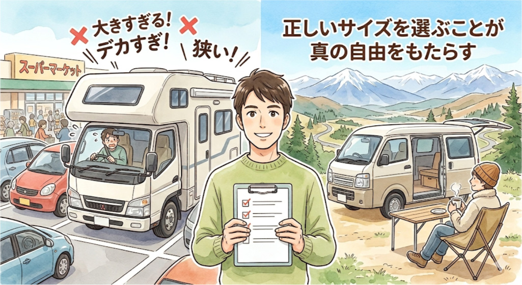 キャンピングカーのサイズ選びは、スペック上の数字を比べることではありません。「あなたの日常と旅の歩幅に、無理なくなじむかどうか」です。