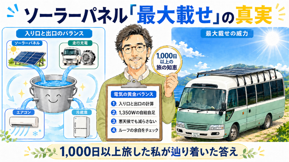 Toggle「ソーラーは必要最小限でいい」という意見もありますが、1,000日以上の旅と試行錯誤を経て、実戦においては「載せられるだけ載せる」のが私が導き出した答えです。カタログの数字を確認するだけでなく、その車両に「それ以上にソーラーパネルを載せるスペースがあるか」を確認しておくことも強くおすすめします。